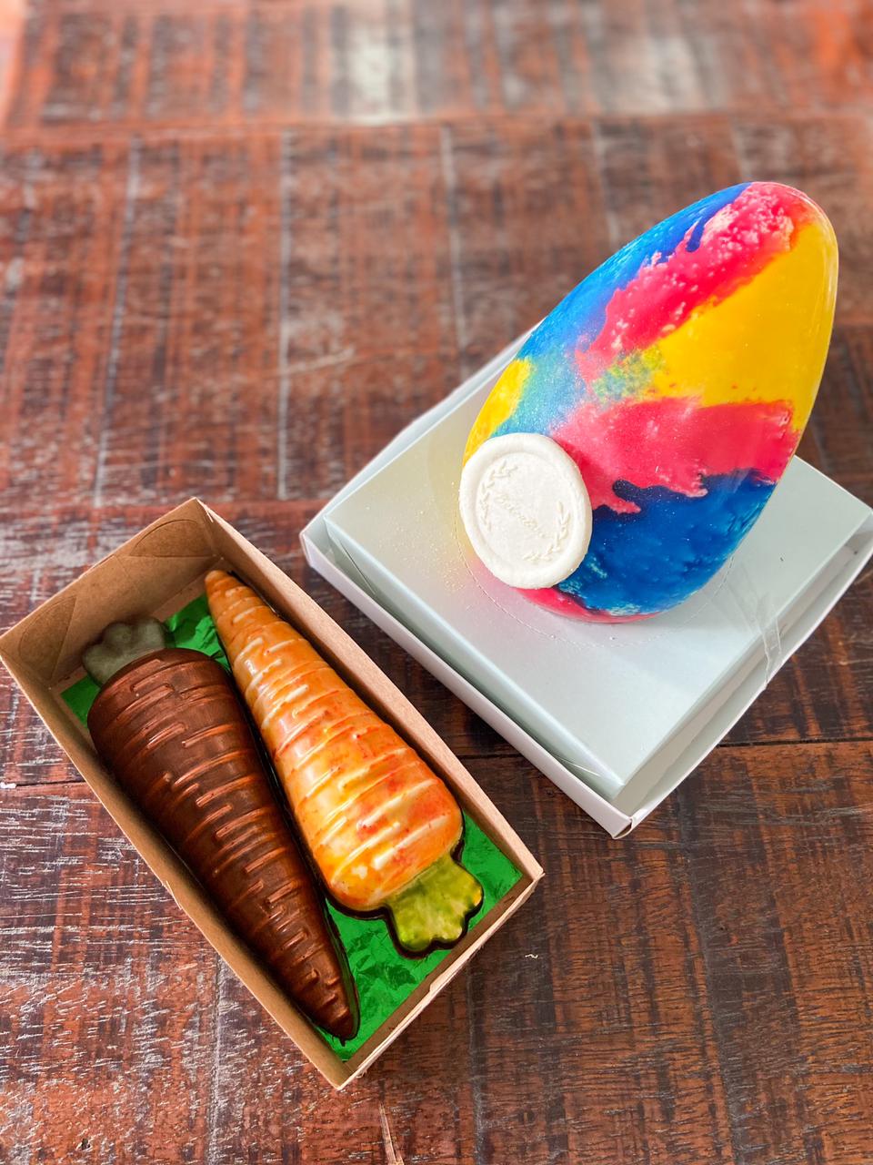 Este ano, a redação da Campinas Cafe selecionou opções veganas para absolutamente ninguém ficar de fora! A Belentani Confeitaria Vegana trabalha apenas com ingredientes sem origem animal e sem glúten. O ovo de chocolate branco tie dye (sim, tie dye!) é recheado de cookies e chocolate sem glúten, que lembra o tradicional chocolate branco, mas com toda a criatividade das cores como aliada. Uma verdadeira obra de arte, que deixou a redação surpresa! Além disso, vale provar as cenourinhas, que são de chocolate branco com recheio de Marshmallow, e de chocolate escuro recheada com chocolates tipo “M&M’s”. Essa é uma ótima opção para presentear crianças com restrições. Elas são divertidas e no tamanho ideal para evitar exageros!