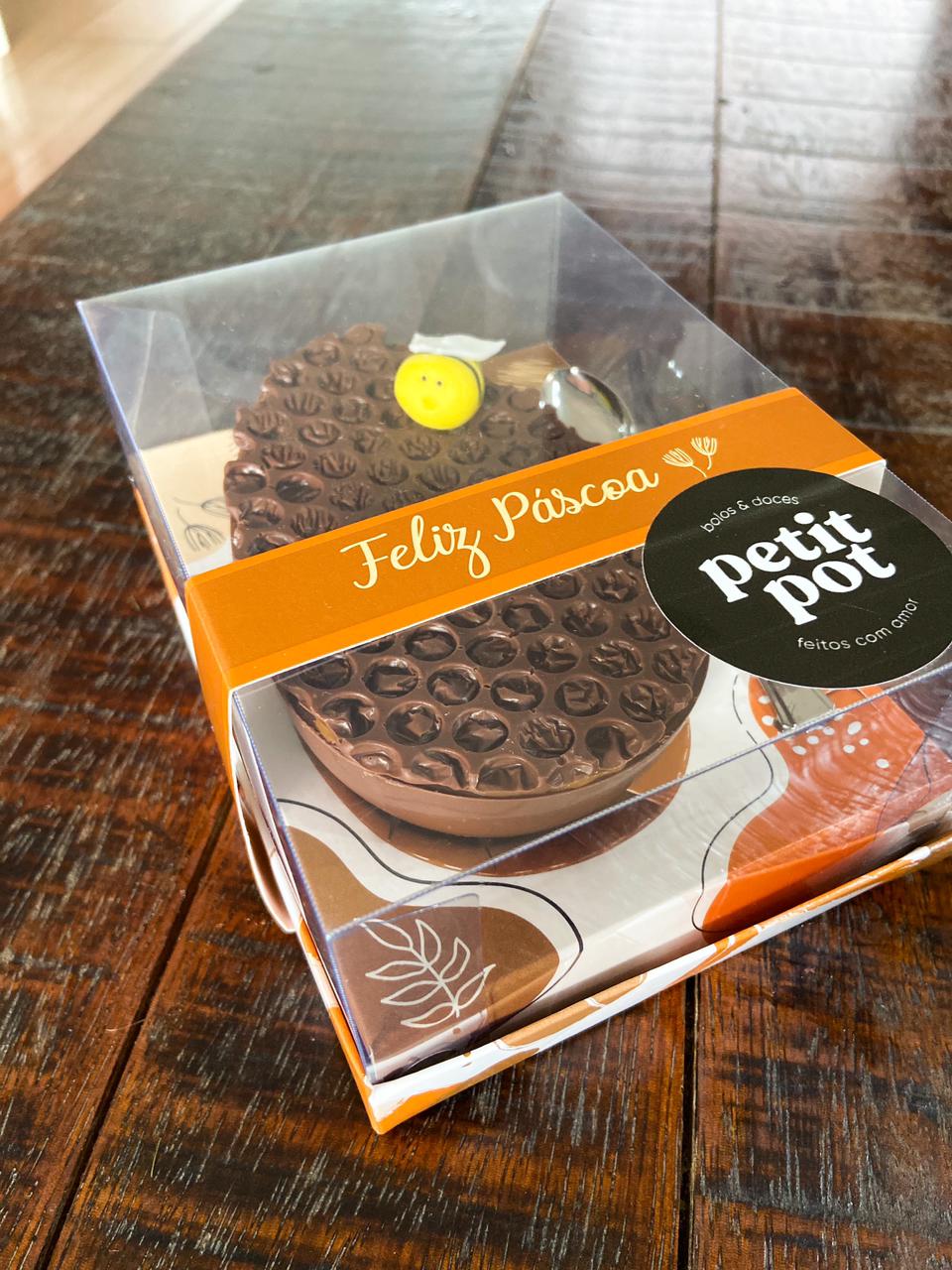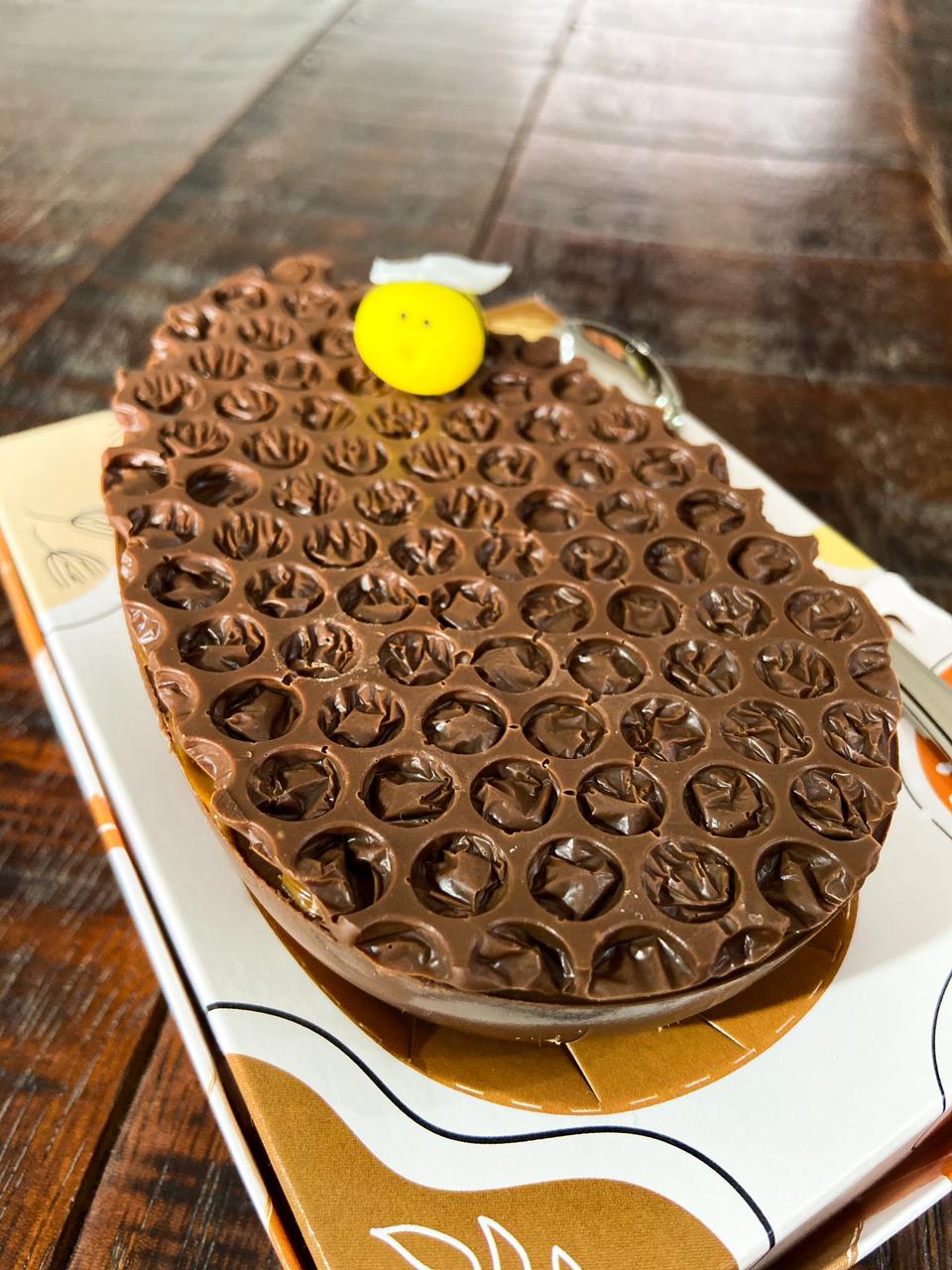 O ovo queridinho da confeitaria criada por Thaís Fonseca, a Petit Pot, é de pão de mel! Com casca de chocolate nobre, recheio de doce de leite caseiro, essa opção deve encantar as crianças, já que seu acabamento conta com uma imitação de favo, e com uma abelha delicadamente esculpida em pasta americana. Vale destacar o recheio super generoso, que deixa a massa molhadinha!