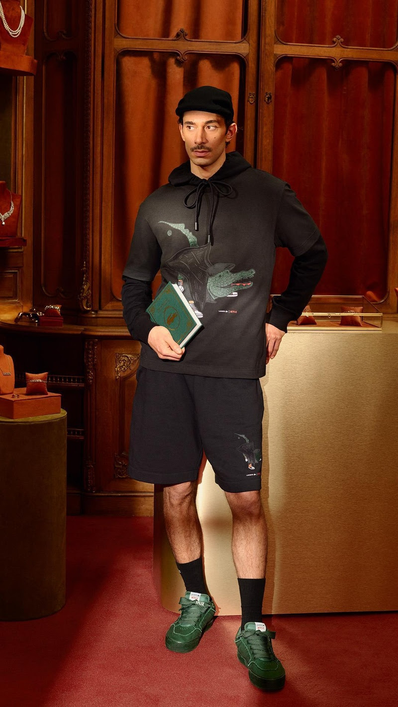 Nesta coleção, o Crocodilo símbolo da marca vestiu os figurinos dos personagens da Netflix estando bordado em todas as peças da coleção, como o rosto muda do Demogorgon, ou uma peruca como a rainha Charlotte. Outras peças têm a estampa dos crocodilos disfarçados navegando entre os gráficos de assinatura da plataforma de streaming.